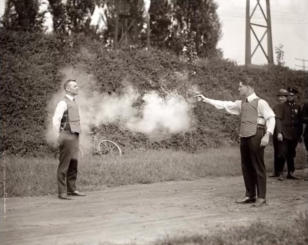 Test kamizelek kuloodpornych. Zdjęcie wykonano w 1923 roku.