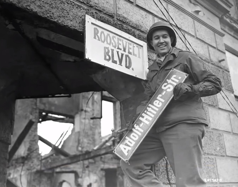 Amerykański żołnierz usuwa tabliczkę z nazwą ulicy Adolf-Hitler-Str i zastępuje ją napisem Roosevelt Blvd.