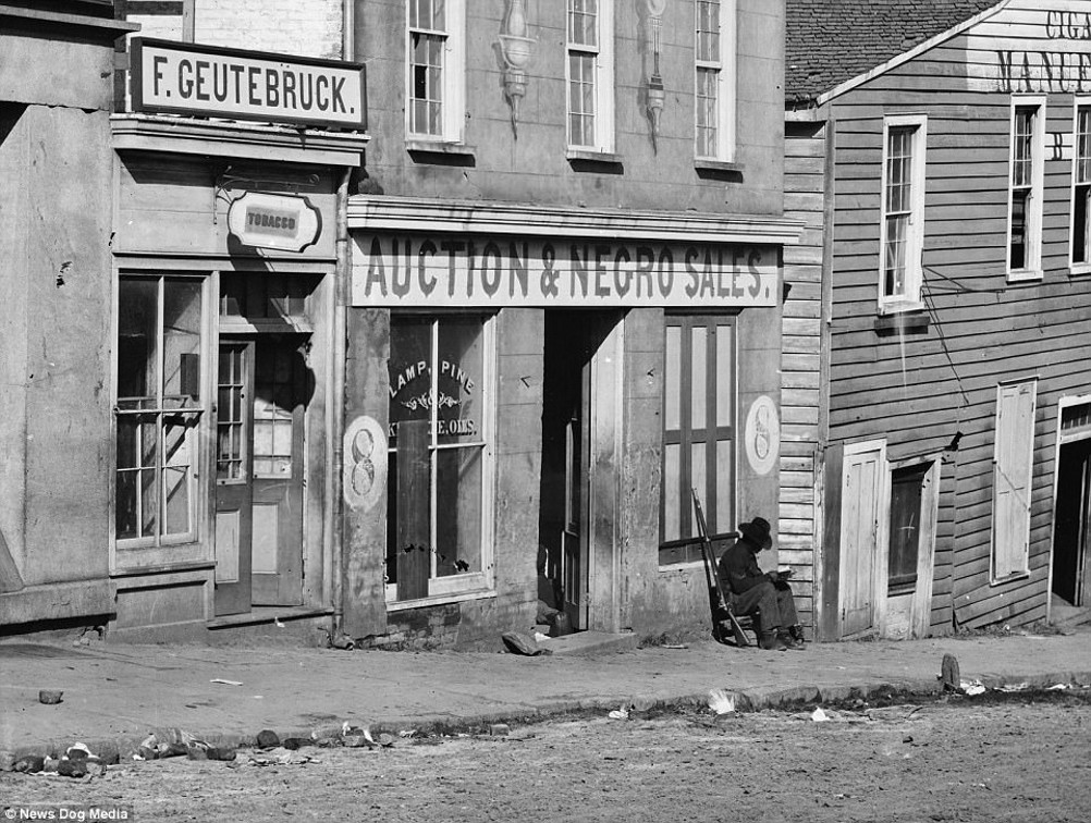 Na budynku widocznym na zdjęciu umieszczono reklamę informującą o wyprzedaży czarnoskórych niewolników. Zdjęcie to zrobiono w roku 1864 w Atlancie. Rok później siły Południa zostały pokonane i niewolnictwo zostało w USA zniesione.